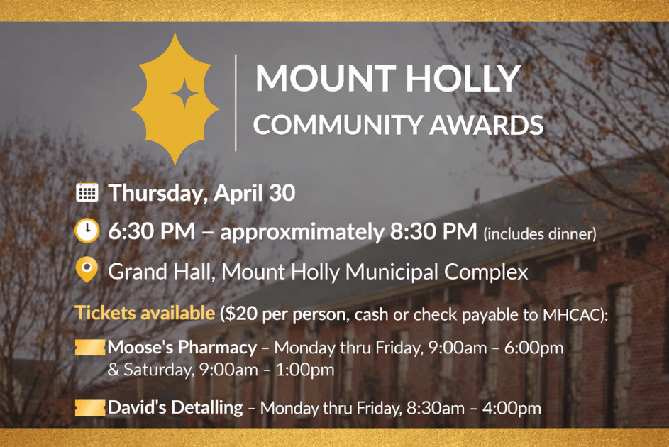 Through this annual nomination and selection process, the Community Awards seek not only to celebrate meaningful contributions, but also to encourage ongoing civic engagement and community involvement. By combining public participation with a structured evaluation process, the awards reinforce transparency, accountability, and shared community pride. Together, these efforts help highlight the individuals and organizations whose service continues to shape Mount Holly’s present and strengthen its future.